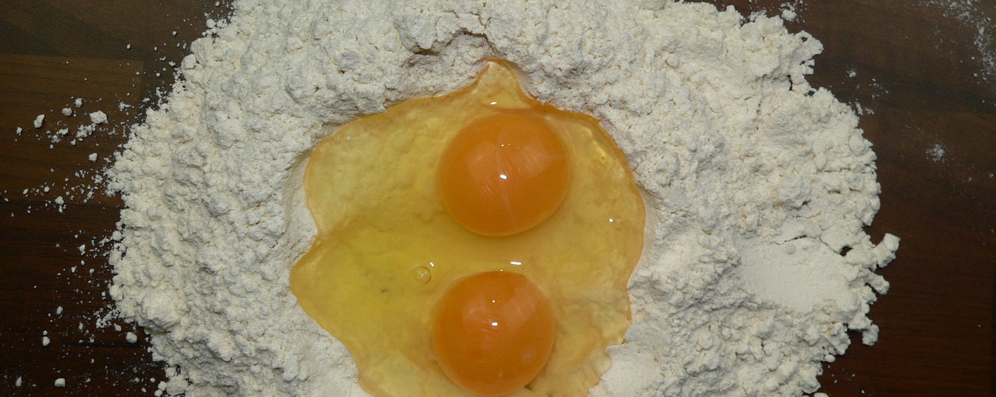 Put the flour on a bench and make a hole in the middle. Put the whole egg in the middle. Start to whisk the egg and the flour using a fork. Slowly mix all together with the same spin.